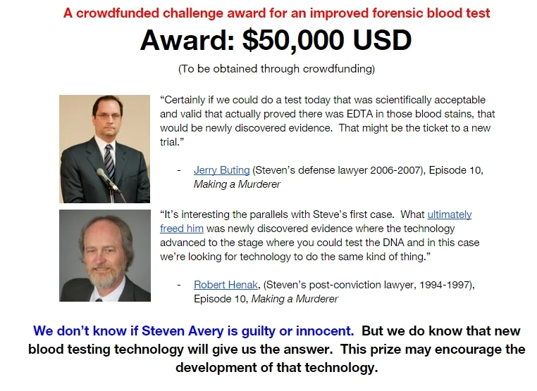 The morning after having watched the last episode, I had a brainstorm that I thought would be a great way to help solve the crime: crowdfund a prize to advance forensic science to improve the test (for "EDTA") that the show implied might exonorate Avery. But after reaching out to experts in the forensic science field, my simple crusade got much more complicated.